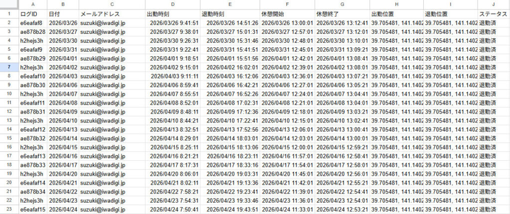 打刻データは自動でGoogleスプレッドシートに反映されます。